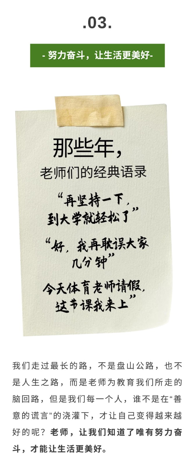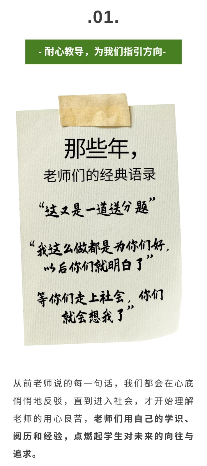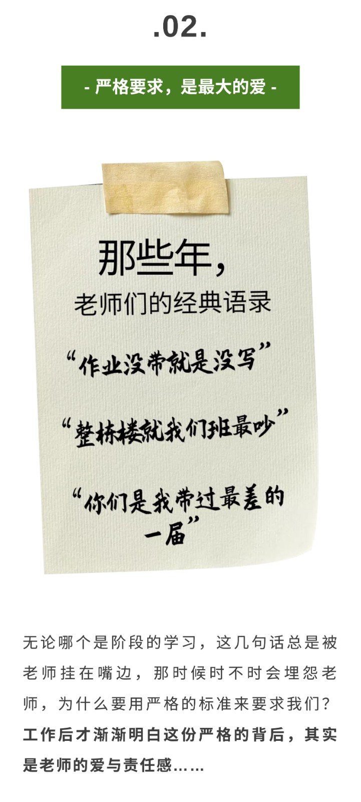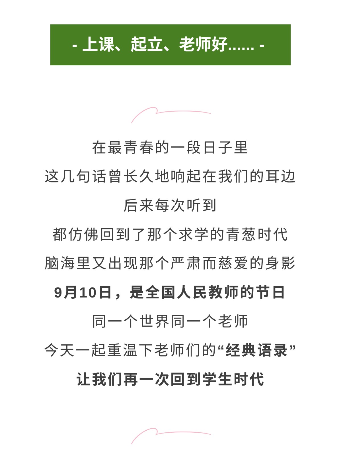 致謝師恩 | 那些年,記得您說過...... - 上課、起立、老師好......?-? 在青春的一段日子里 這幾句話曾長久地響起在我們的耳邊 后來每次聽到 都仿佛回到了那個求學的青蔥時代 腦海里又出現那個嚴肅而慈愛的身影 9月10日,是全國人民教師的節日 同一個世界同一個老師 今天一起重溫下老師們的“經典語錄” 讓致謝師恩 | 那些年,記得您說過...... - 上課、起立、老師好......?-? 在青春的一段日子里 這幾句話曾長久地響起在我們的耳邊 后來每次聽到 都仿佛回到了那個求學的青蔥時代 腦海里又出現那個嚴肅而慈愛的身影 9月10日,是全國人民教師的節日 同一個世界同一個老師 今天一起重溫下老師們的“經典語錄” 讓